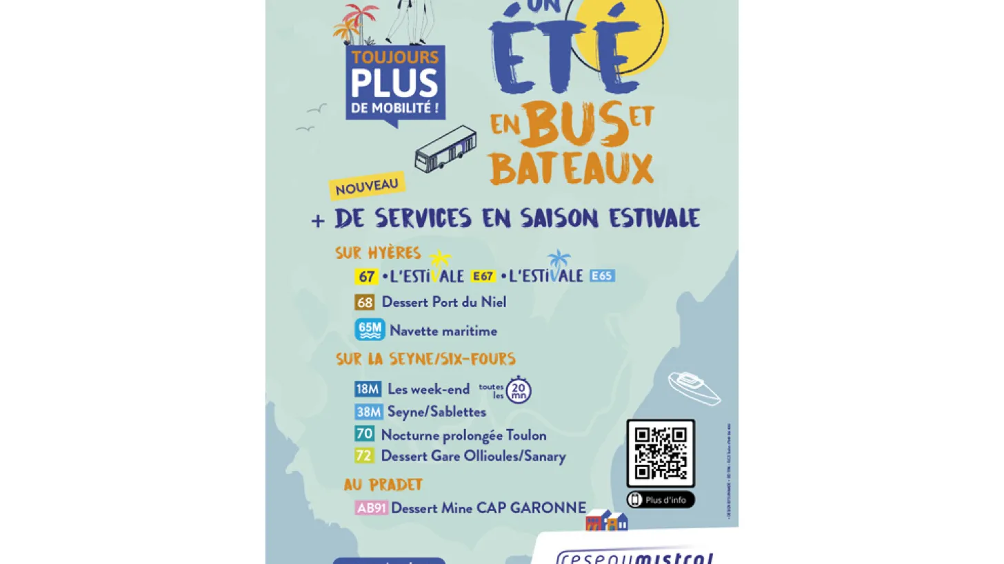 Pendant l'été, la Métropole TPM et son réseau Mistral s'adaptent pour permettre à tous de profiter au maximum de la saison estivale sur l'ensemble du territoire. Des nouveautés, des horaires adaptés pour les bateaux-bus et des offres de lignes touristiques sont en place pour faire de votre mobilité une priorité.
