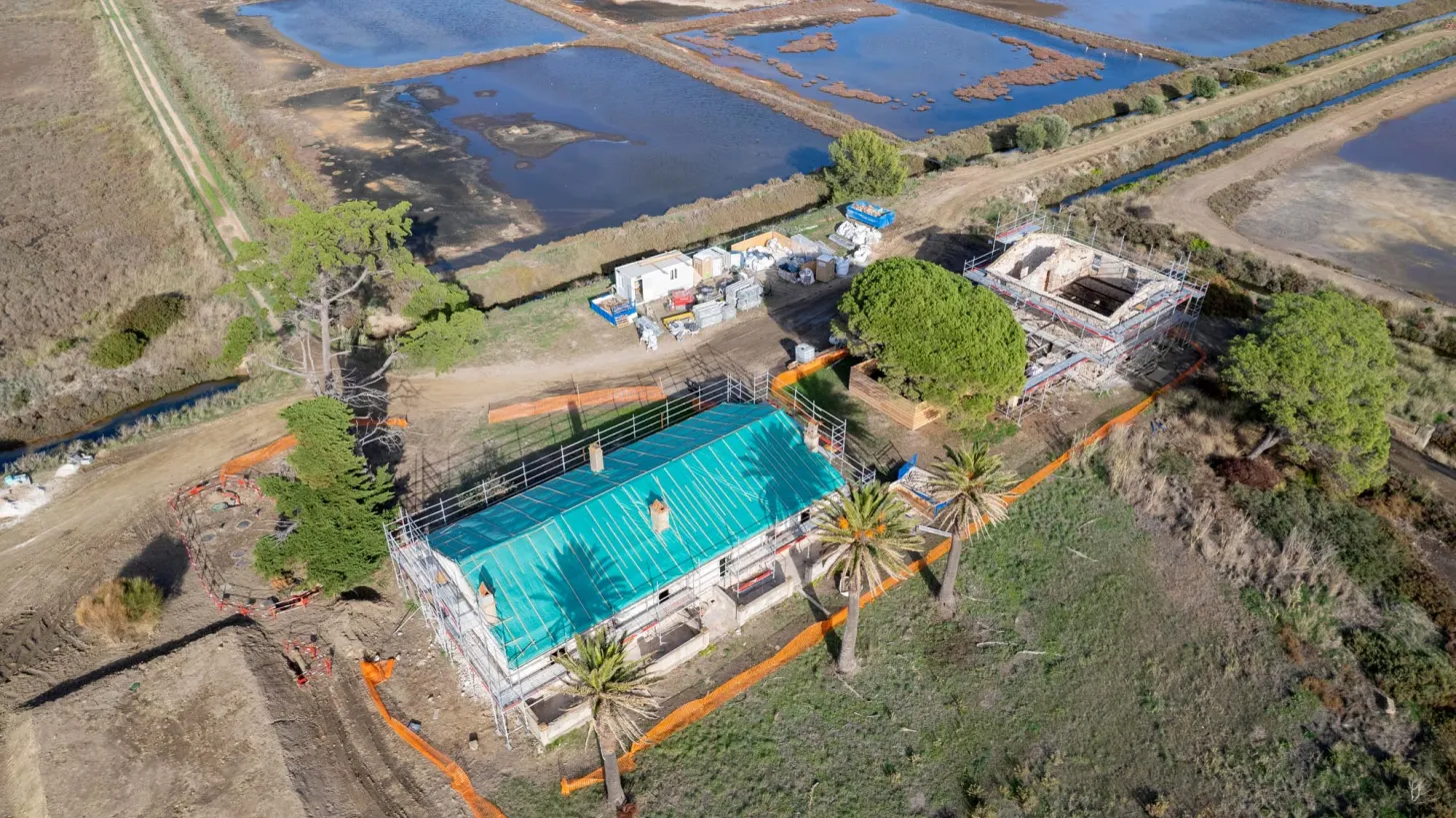 Vous observez actuellement des échafaudages en plein cœur des salins des Pesquiers d'Hyères ? Rassurez vous, il s'agit d'une opération de restauration du patrimoine salinier. Semblant flotter sur l’eau depuis la route de La Capte, les anciens bâtiments, dits de la grande machine, ou autrement appelés Tympan, seront effectivement les prochains bâtiments patrimoniaux que vous pourrez visiter sur ce site exceptionnel. En vue de leur future ouverture au public au printemps 2024, ils font actuellement l’objet de travaux de restauration cofinancés par le Conservatoire du littoral, un mécène privé via la Fondation du Patrimoine, la Région SUD, la Métropole TPM, et l’État par la DREAL.