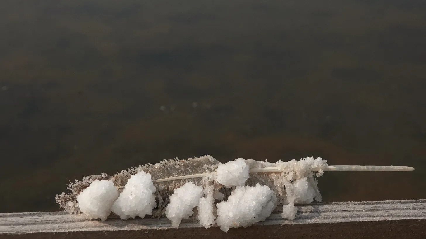 - Comme une offrande à la nature. Une invitation est lancée au grand public, venir aux salins pour y déposer soigneusement un objet personnel en immersion dans les tables des salins. Cette première étape collective d’offrandes amorce le processus de transformation des objets qui, avec le temps, vont se solidifier pour aller jusqu’à ce changement d’état qui est la cristallisation, ce mécanisme devient alors l’armure, le cocon, ou encore l’exosquelette de cristaux de sel de ces objets de l’intime.