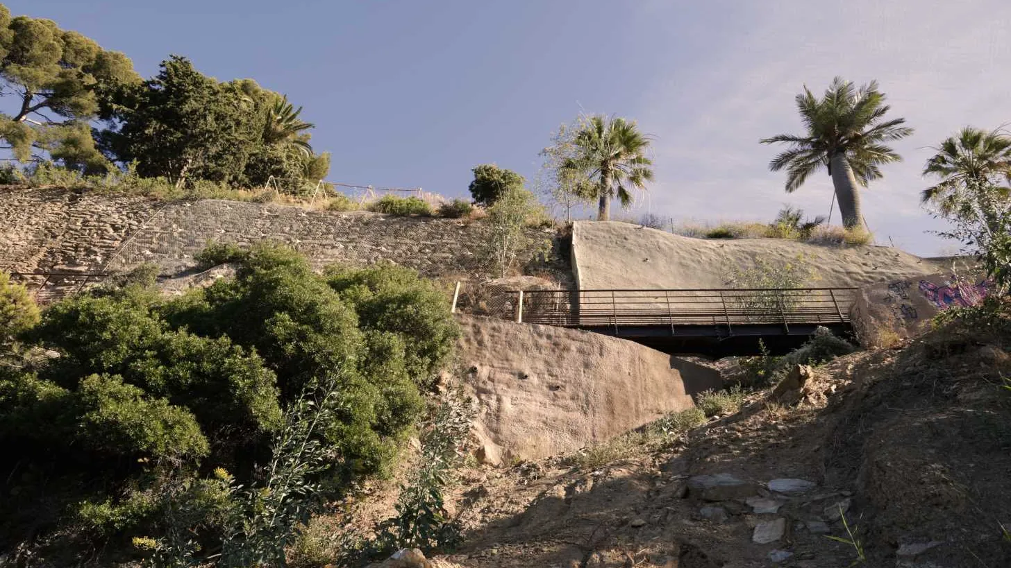 Le talus en amont du sentier, correspondant à la cicatrice du glissement, a été traité par la réalisation d’ouvrages de confortement type paroi clouée et microberlinoise ancrée. Les travaux au droit de cette section correspondent à la création d’une passerelle (structure métallique) de franchissement, en intégrant la sécurisation des appuis de fondation de l’ouvrage et la pose d’un double garde-corps métallique.