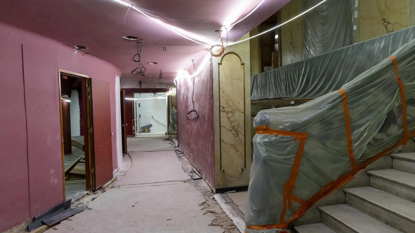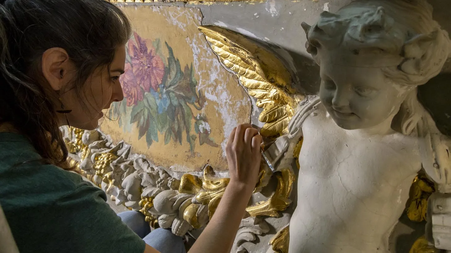 Au cœur du chantier, la grande salle offre ainsi un spectacle rare : un échafaudage monumental permet d’approcher de très près la toile marouflée du plafond, actuellement en cours de nettoyage, de restauration et réintégration de peinture. Une occasion exceptionnelle pour les visiteurs de découvrir, presque à hauteur d’artisan, le travail minutieux réalisé sur ces décors emblématiques.