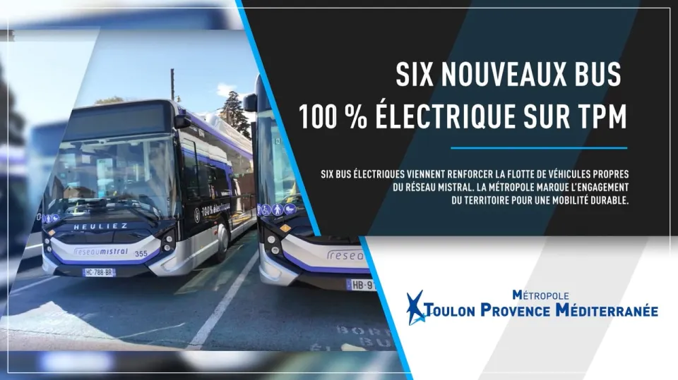 Déployés dès aujourd’hui sur la ligne 15 à Toulon - entre le bas-Faron et la place de la Liberté - 6 nouveaux bus 100 % électrique viennent renforcer la flotte de véhicules propres du réseau Mistral. Équipés des dernières technologies, ils feront économiser 225 tonnes de CO2 par an au territoire. Une avancée significative au bénéfice de la qualité de l’air et en faveur d’une mobilité plus respectueuse de l’environnement.