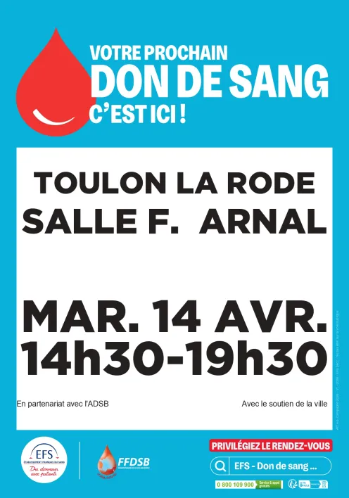 Une collecte de sang se tiendra le mardi 14 avril 2026, de 14h30 à 19h30, à Toulon La Rode, Salle F. ARNAL. Cette mobilisation solidaire vise à accueillir 56 donneurs pour contribuer à sauver jusqu’à 168 vies.