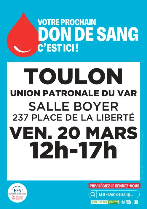 Rejoignez la prochaine collecte de sang organisée le vendredi 20 mars de 12h à 17h à l’UNION PATRONALE DU VAR, en prenant RDV ici !