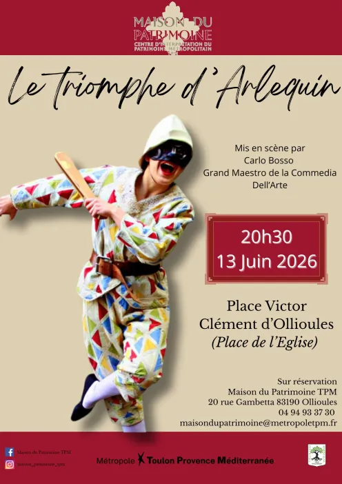 La Maison du Patrimoine TPM vous donne rendez-vous à Ollioules pour une soirée haute en couleur avec Le Triomphe d’Arlequin. Mis en scène par Carlo Bosso, grand maître de la commedia dell’arte, ce spectacle drôle et rythmé promet un moment convivial au cœur du centre ancien.