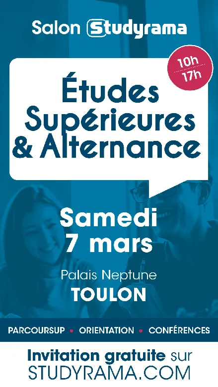 Le salon Studyrama des Etudes Supérieures et de l’Alternance de Toulon vous donne rendez-vous au Palais Neptune, le samedi 7 mars 2026, pour préparer votre futur !